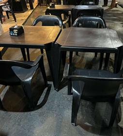 25 Jogos de mesas na cor preta, cada mesa possui 4 cadeiras acompanhando, e 02 freezeres verticais, marca Metalfrio